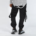 A pair of woven knit pants featuring an elasticated waistband with drawstring. It features multiple functional pockets, including two cargo pocket with strap detail, and elasticated, banded ankle cuffs.