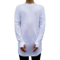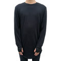 Comfy longline pullover with crew neckline, featuring a relaxed fit, ribbed cuffs with thumb holes.