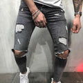 Slim-fit jeans with zip fly and button closure, regular waist. Features a knee ripped, distressed design. Has traditional five-pocket construction.