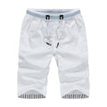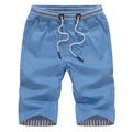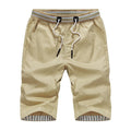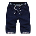 A cotton woven pair of shorts with an elasticated waist and drawstring fastening features two slanted side pockets, a single back pocket, and a foldable hemline.